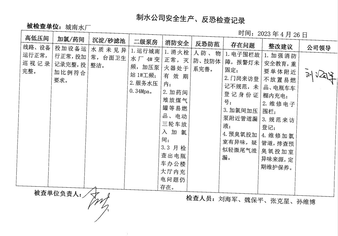 城南水廠2023年4月安全生產檢查記錄