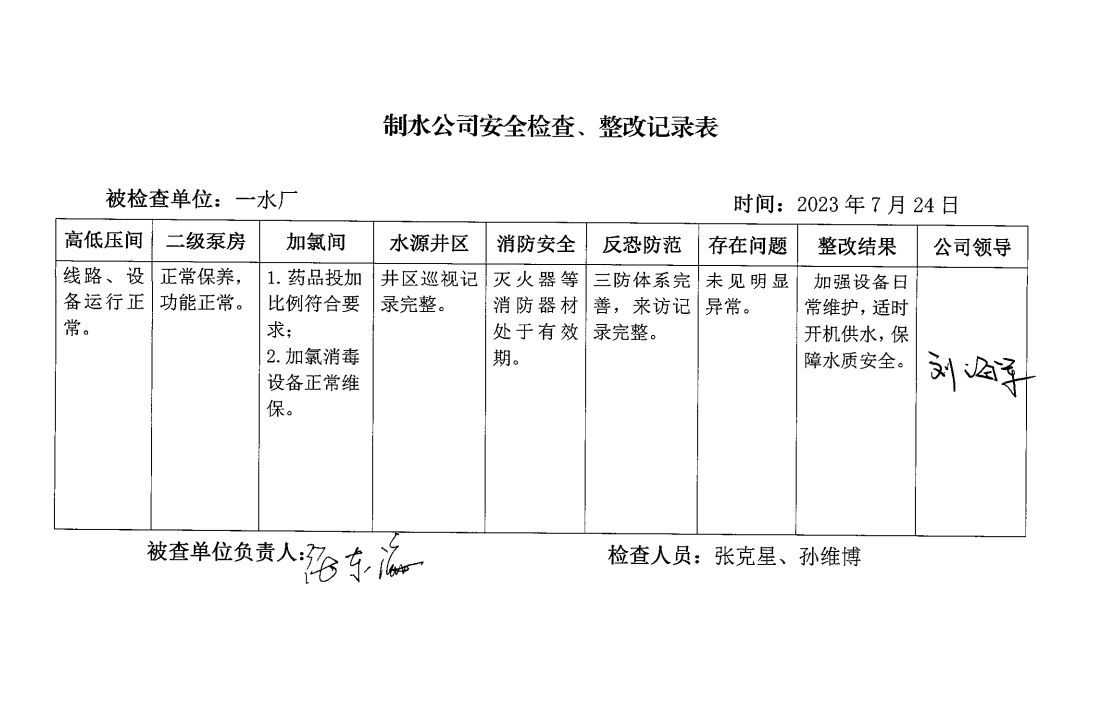 一水廠2023年7月安全生產(chǎn)檢查記錄